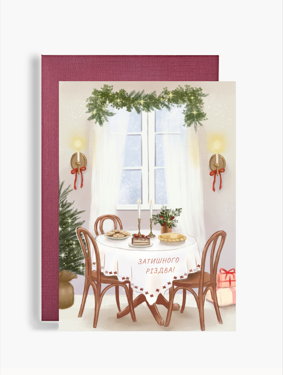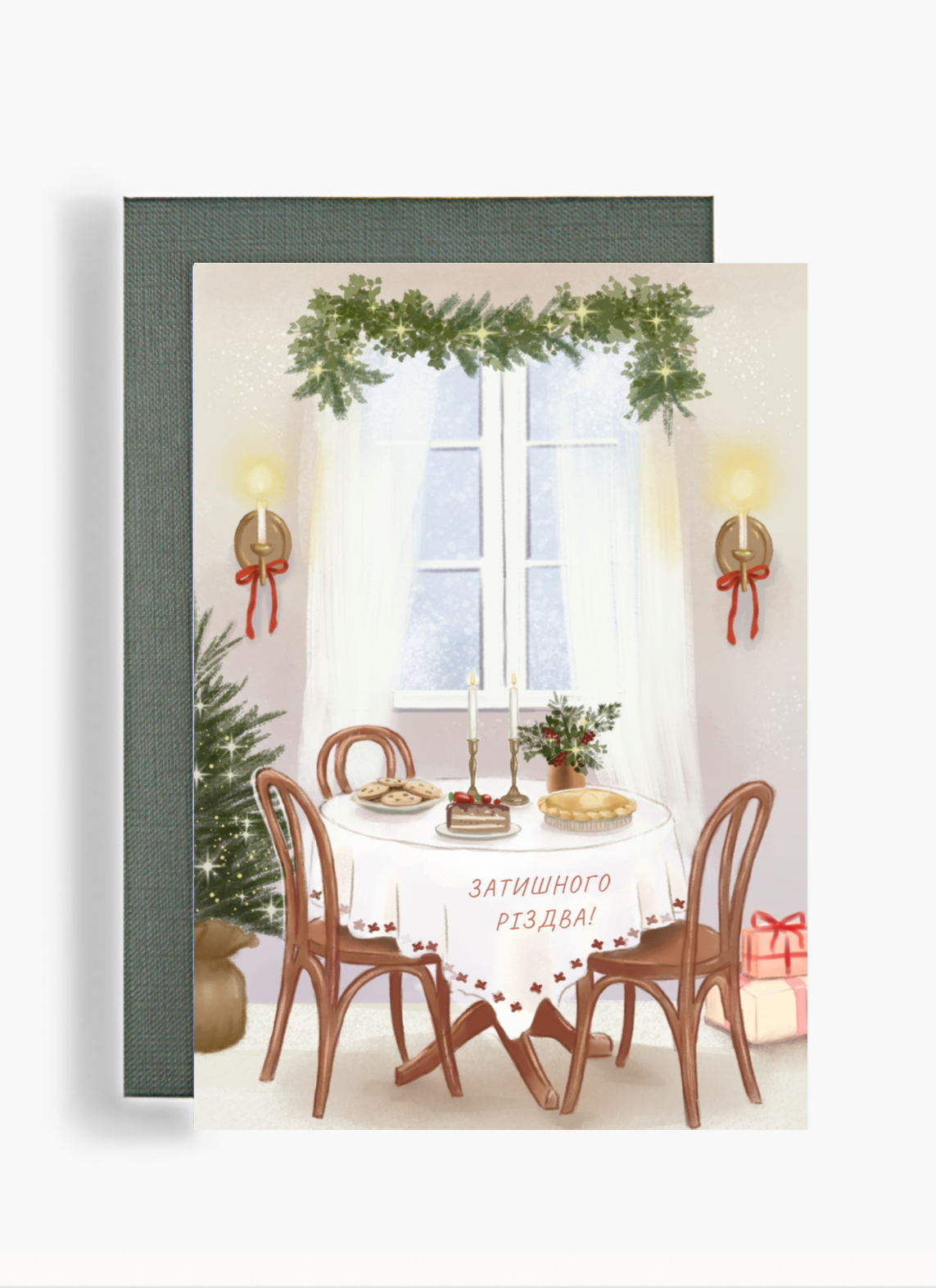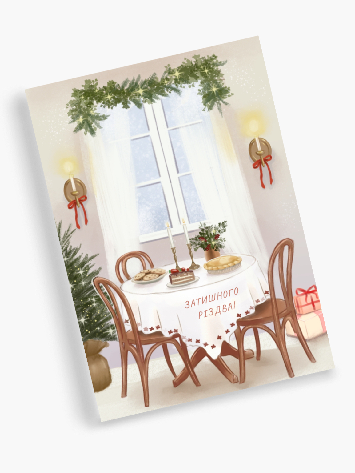 Листівка «Різдво» — це не просто папір, а крихітний світ зимової казки. Її витончена ілюстрація із затишним різдвяним столом, що сяє в теплому світлі, одразу створює відчуття спокою та очікування дива. Кожна деталь — від чашки на столі до маленьких прикрас — наповнює душу теплом.
