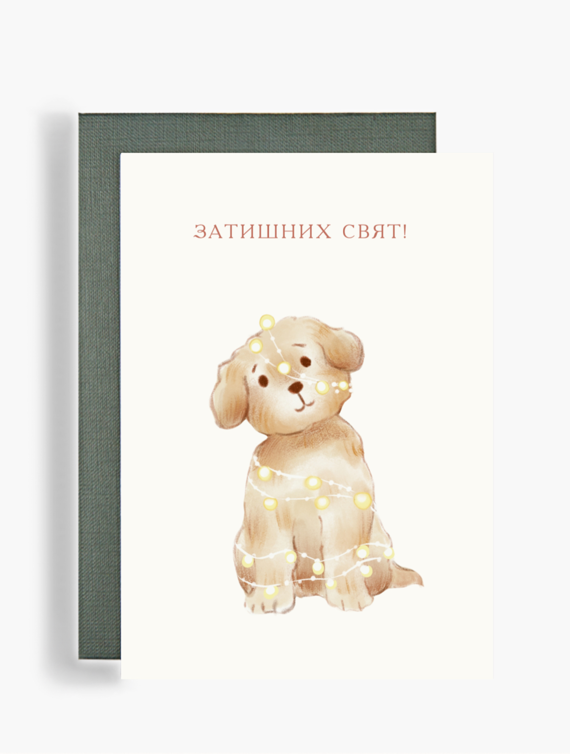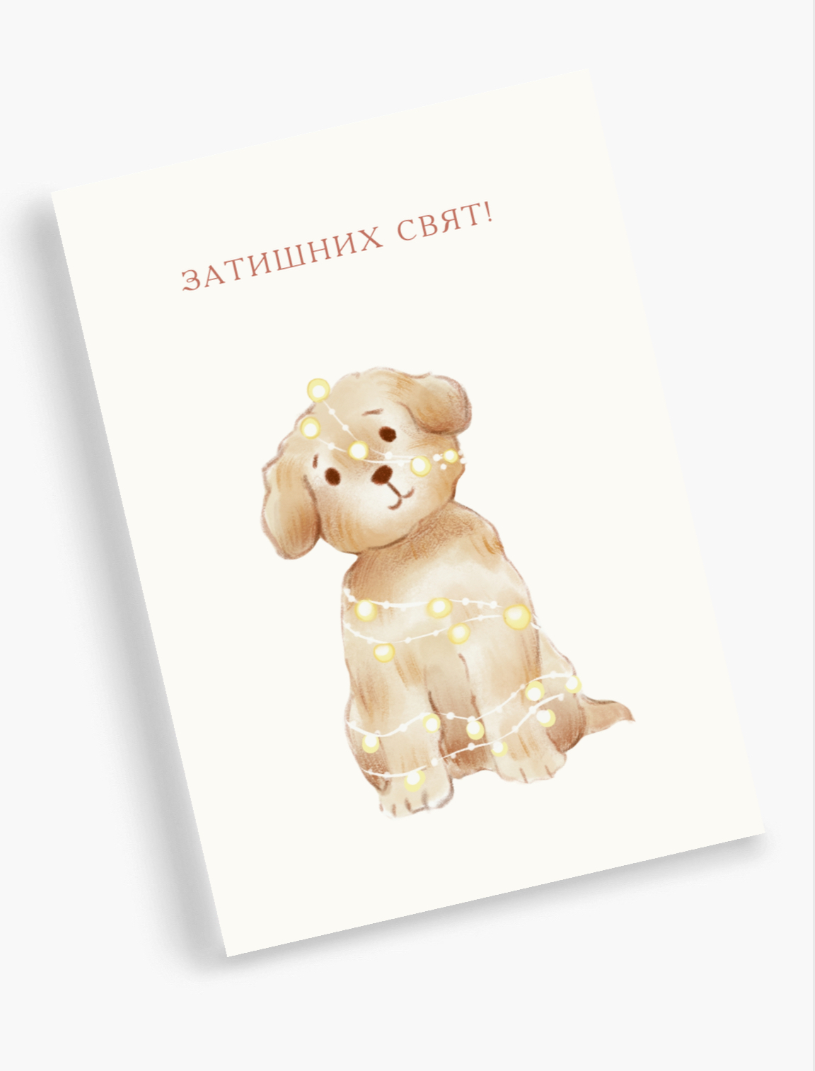 Листівка «Затишних Свят» — це не просто папір, а крихітний світ, наповнений теплом і любов’ю. Її зворушлива ілюстрація, де миле цуценя заплуталося в гірлянді, одразу дарує відчуття затишку та посмішку. Вона не залишиться непоміченою, адже ніжний дизайн і ваші слова подарують найприємніші емоції.