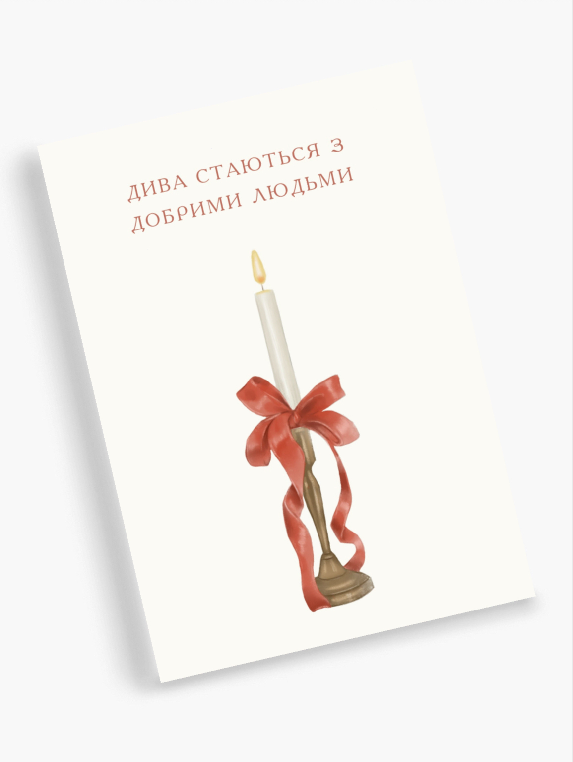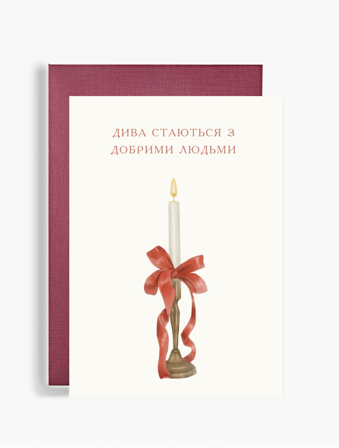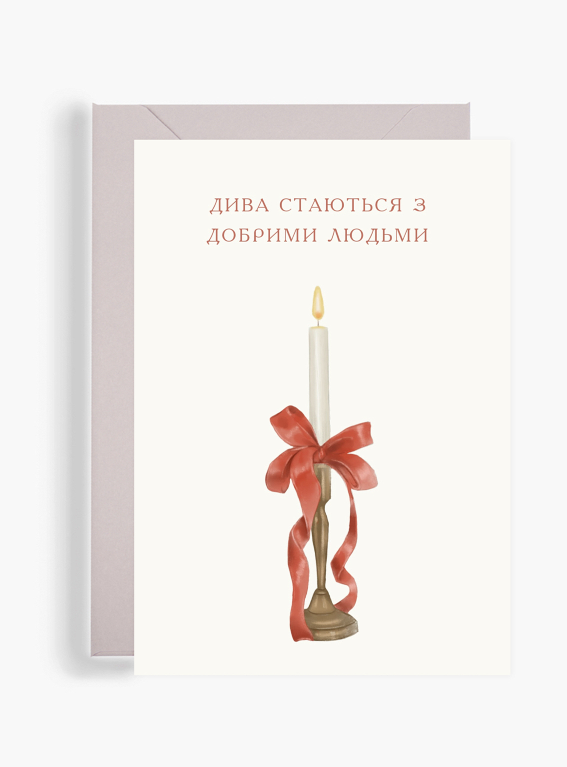 Листівка «Дива стаються» — це справді чарівний прояв турботи. Її неймовірно атмосферна ілюстрація, на якій зображена запалена свічка, огорнута атласною стрічкою, миттєво створює затишок. Вона стане світлим нагадуванням для дорогої людини, що дива завжди поруч, а ваші щирі слова зроблять їх ще ближчими.