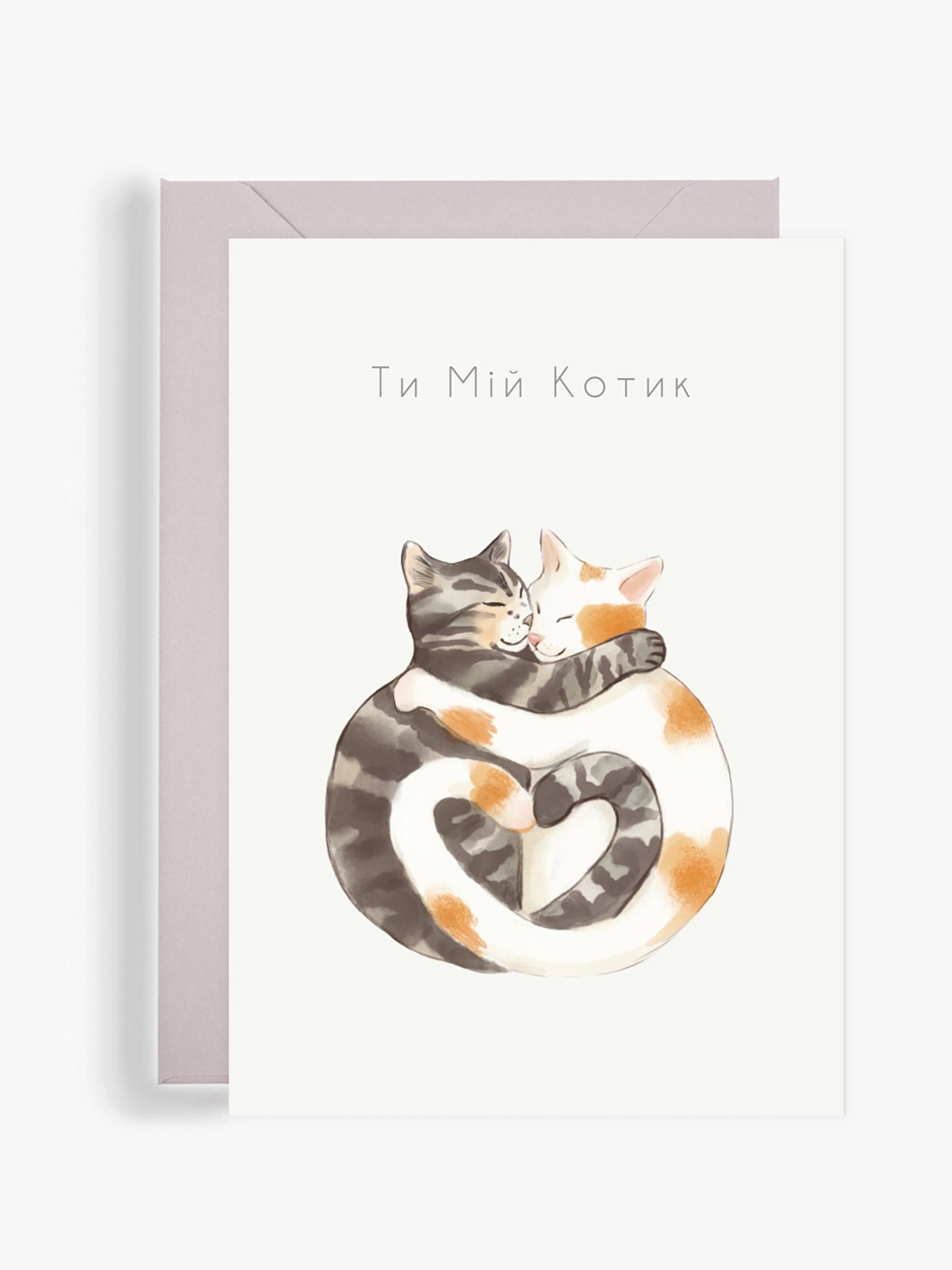 Вітальну листівку Мій котик можна придбати як без конверту, так і упаковану у сірий або синій конверти