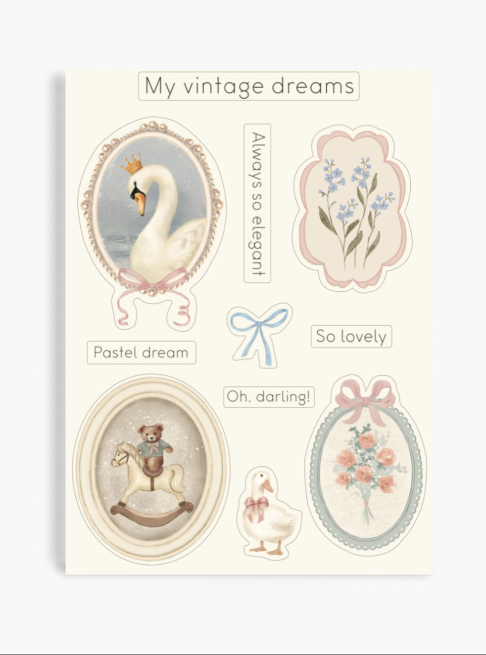 Вінілові стікери «My Vintage Dreams» — це не просто набір, а крихітний світ ностальгії. Кожен елемент цієї колекції, від імітації поштових марок до витончених візерунків, одразу створює відчуття подорожі у часі. Вони не залишаться непоміченими, адже їхній дизайн дозволяє перетворити звичайні речі на справжні витвори мистецтва.